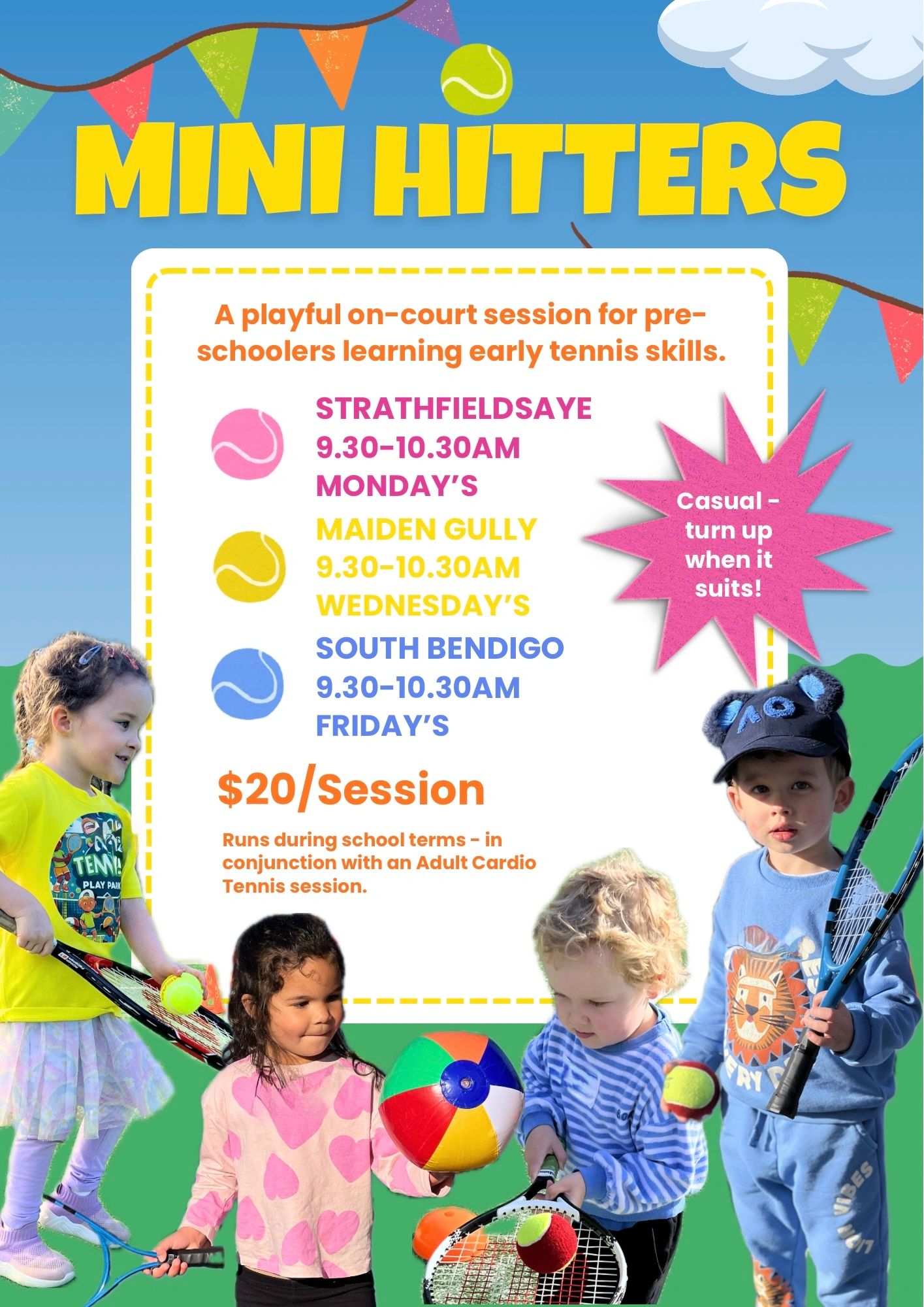 Mini Hitters is a playful, movement‑packed tennis session for pre‑schoolers aged 5 and under - perfect for little ones who love to run, explore and try new skills. It’s a fun, low‑pressure way to introduce your child to tennis, helping them build early coordination, confidence and energy on court. No term commitment, no experience needed - just turn up when it suits you!